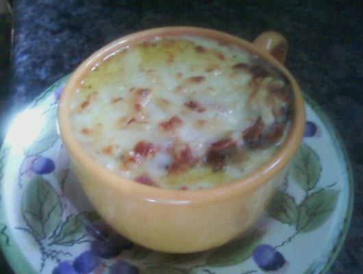 Ladle soup into an ovenproof bowl, add toasted bread and cover with soy cheese.