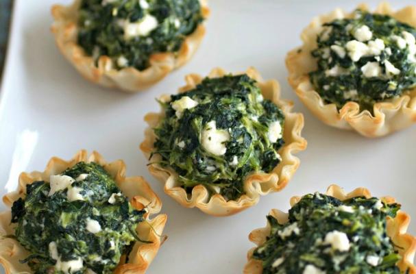 Place all phyllo shells on a baking sheet and fill each with 1 tablespoon of the spinach/feta mixture. Baked in preheated oven for 12-15 minutes, until mixture is heated throughout and shells are nice and toasty. Serve immediately.