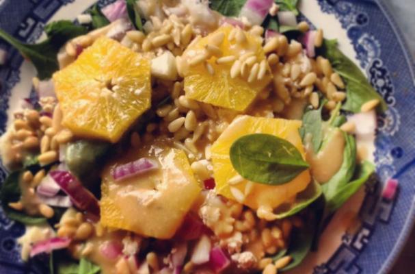 Toss oranges, fennel, spinach, onion, chevre and pine nuts in large bowl.