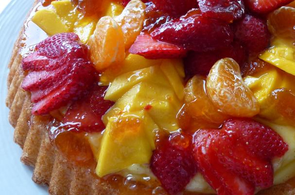 There is no need to tackle pie crust dough with this strawberry mango fruit flan recipe. The sponge cake base is easy to make and perfect for the creamy custard filling. It is baked and then brushed with an orange liqueur syrup to moisten and enhance the flavour of the sponge cake. It is then topped with the crème pâtissière filling, which is brought up an extra notch by adding a touch of Galliano liquere. Refreshing strawberries, mango, and clementine slices and a simple glaze add the finishing touch to this luscious dessert.