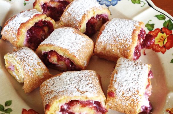 This flour-less sponge cake is light and airy. Each roll is layered with a light sweet cream filling and homemade jam. So go ahead and indulge a little without the guilt.