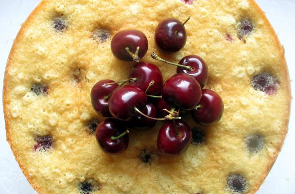 Pour the mix into a round baking-tin, approximately 23cm in diameter. Place the cherries in the mix.