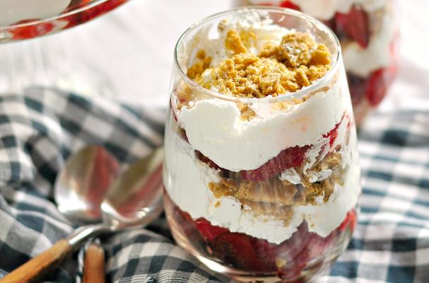 Place 3 tablespoons of strawberries in the bottom of a small glass jar, top with ⅓ crumbled graham cracker, cover with 2 heaping tablespoons of cool whip. Repeat layers. End with cool whip and then use remaining crumbs over the top of the cool whip.