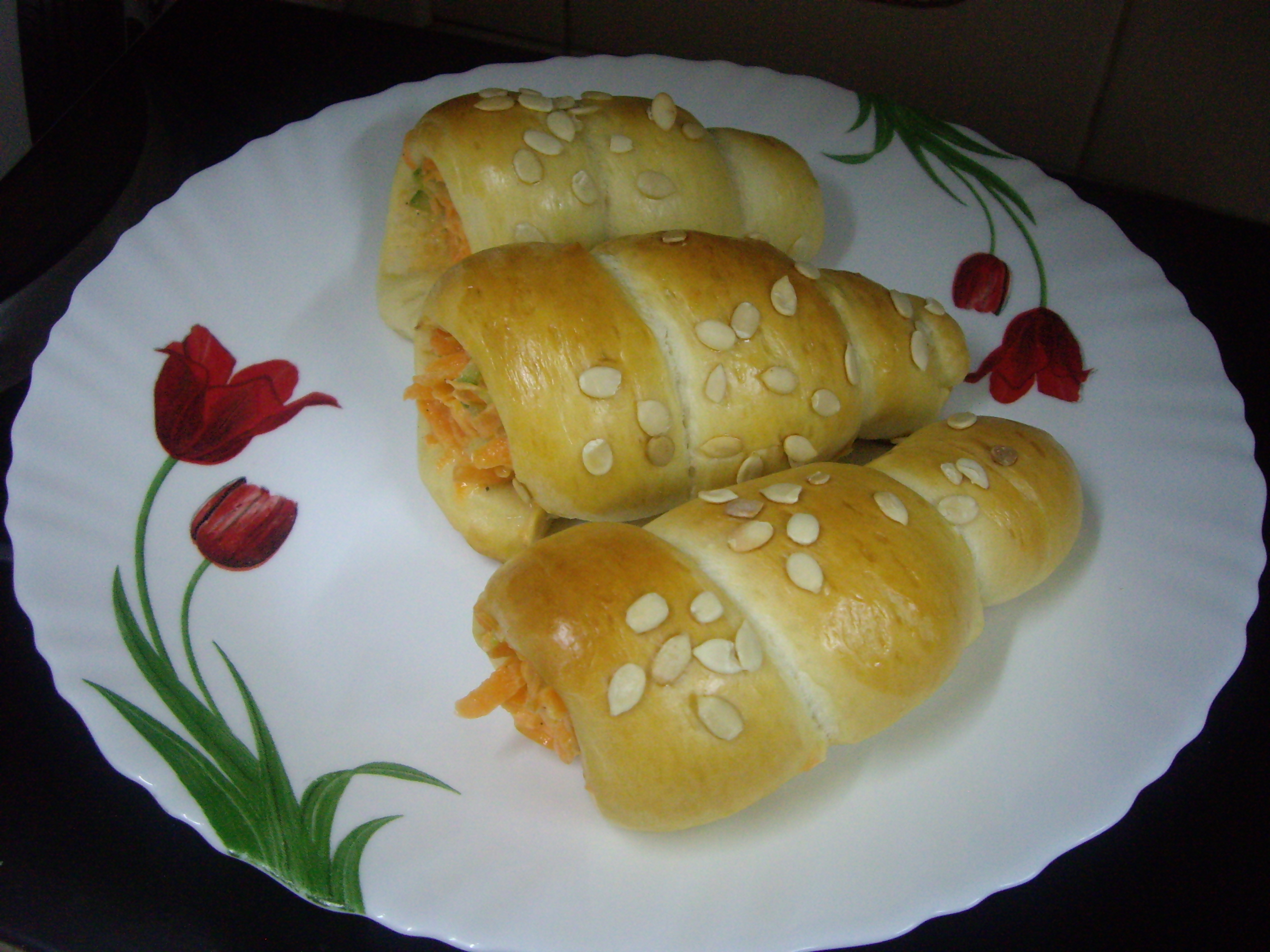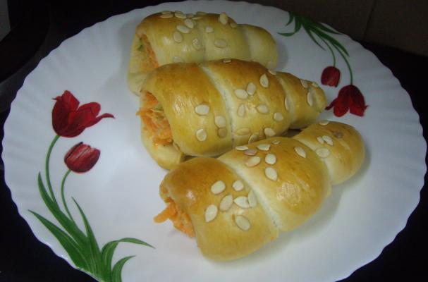 Make the cones out of card stock paper material or news paper. Tape the cones and then cover them well with aluminum foil, so that no paper shows.Set them aside. Now cut the dough into 8 pieces. Allow the dough to rest for 5 minutes. Take each piece of dough and roll into a rope.Roll the dough ropes around the greased horn tubes.Place onto a cookie sheet lined with parchment paper and brush with the egg glaze. Sprinkle sesame seeds or poppy seeds.Cover with plastic wrap. Allow to rest for 30 minutes in a warm environment.Bake in a preheated 350 degree oven for 20 - 22 minutes or till golden brown. Fill them with your favorite filling and enjoy!!here I use veg filling(carrot,cabbage,cucumber( all grated)mix with 2 tbsp mayonnaise nd pepper…tasty 1..u can add chiken or sausage as u like .if u like sweet one then fill it with whipping cream nd nuts