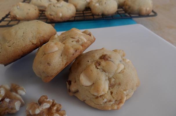 Preheat to 375. In a mixing bowl (or a mixer), combine the egg, butter, vanilla extract, and sugars. Mix until creamy. Add the flour, baking soda, salt and mix until combined. Finally, add the white chocolate chips and chopped walnut and fold into the dough. Roll small spoonfuls of the cookie dough into balls and place a few inches apart on a lightly oiled cookie sheet. Bake for 11 minutes or until the cookies are just beginning to turn golden brown.