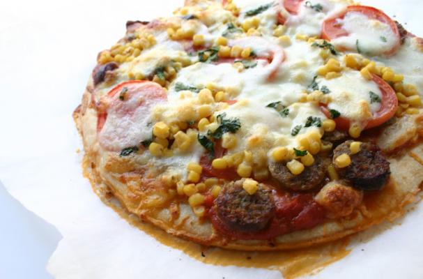 Spread with marinara sauce on top of pizza crust, then top with corn mixture, tomatoes and sausage (if you decide to go the "meat please" route)