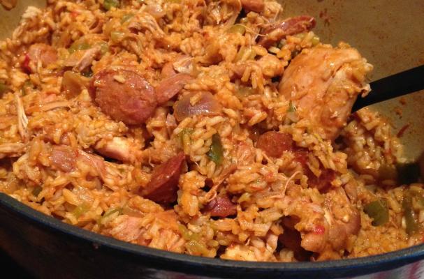 This dish is very simple to make but the flavors are absolutely fantastic!!! Boneless skinless chicken thighs are perfectly fork tender, spicy andouille sausage, traditional bell peppers, onions and celery. Fresh garlic, crushed tomatoes a bay leaf and cajun seasoning add incredible flavor to this one pot dish; yes the rice is cooked right in there too! Seriously, you all have got to make this it is so good!!!