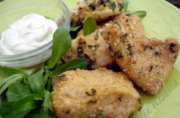 Dip the chicken pieces into the beaten egg, then into the breadcrumb mixture.