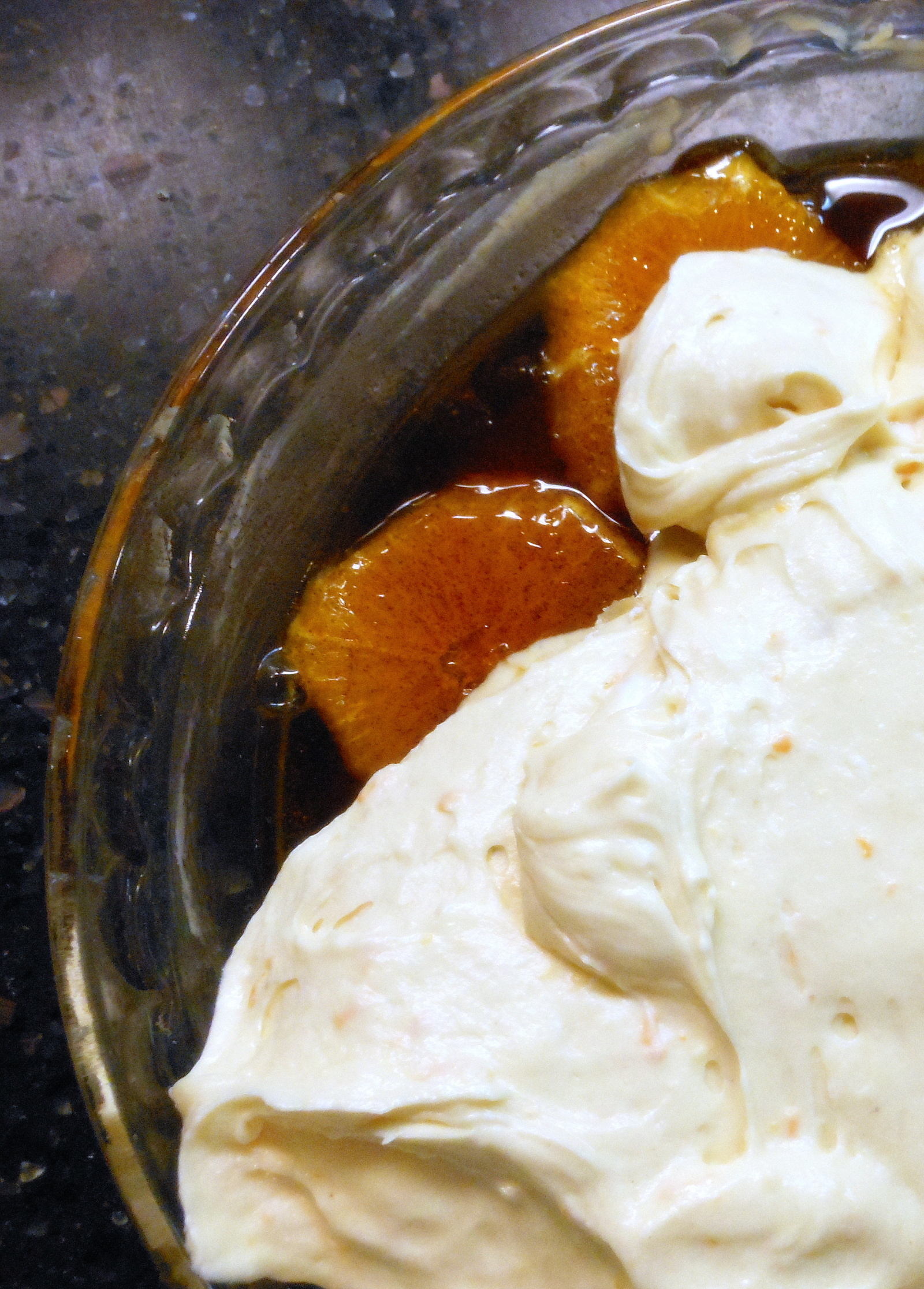 Pour the cake batter over the cooled caramel and oranges, smoothing for an even layer.