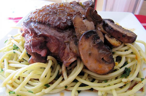 This is a recipe for those lazy weekend days where time is in abundance. Though there are a lot of steps, some of them can be done and then set aside. I like to get the mushrooms browned and onions braised, then take a break and finish the rest later in the afternoon. French cooking techniques allow you to get some truly decadent flavors and textures, and we love the way the herbed noodles underneath pick up all that thick, delicious sauce.