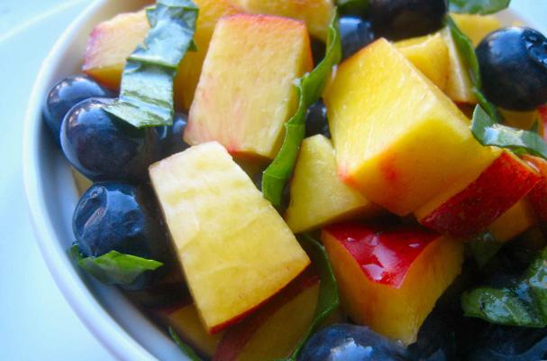In a medium bowl, combine nectarines and blueberries. Pour dressing over fruit and toss to coat. Gently stir in basil.