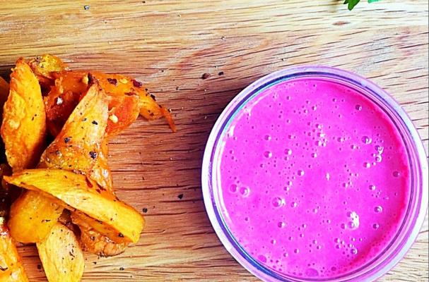 Oven Roasted Sweet Potatoes with a Beetroot Yoghurt Dip