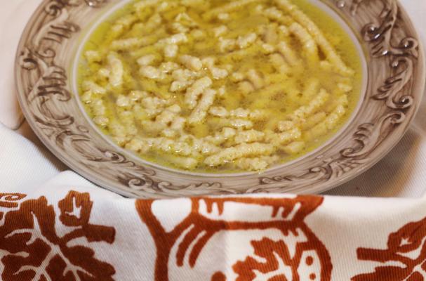 Bring broth to boil, put dough into the potato ricer, squeeze the dough over the pan cutting when passatelli are long enough.