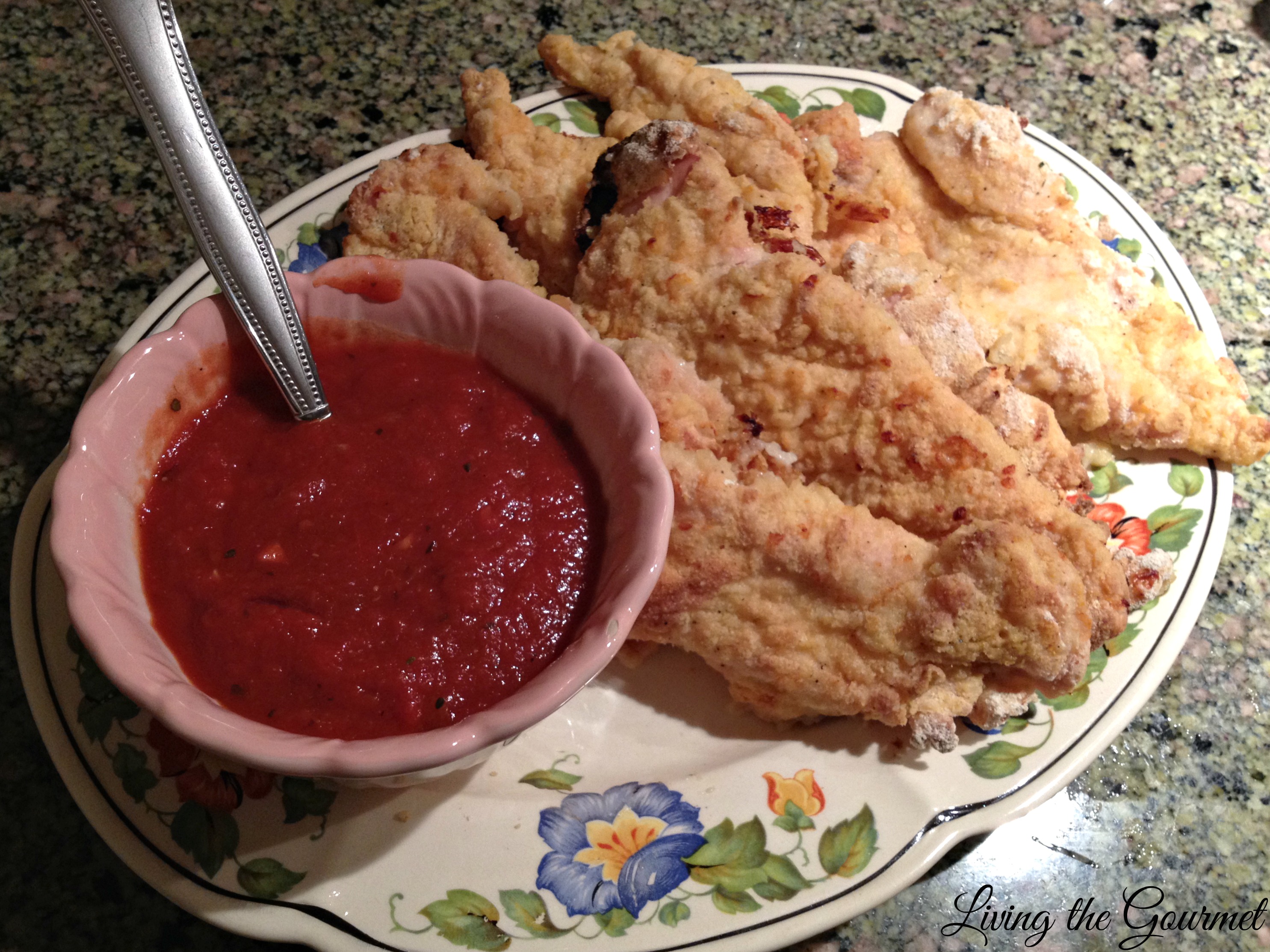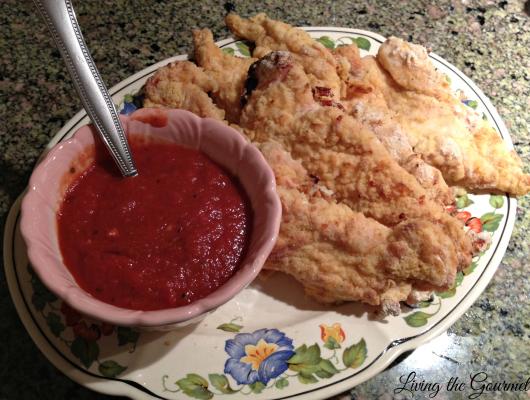 Dip the chicken in the flour mix, milk bath and back in the flour mixture. Place in a baking pan with a drizzle of vegetable oil and bake for 20 – 25 minutes or until the chicken is slightly golden and the juices run clear.