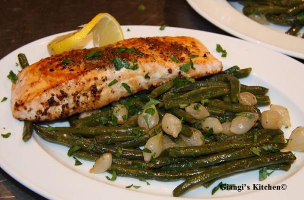 Cooking the salmon in the same skillet as the green beans, because some of the caramelized is still on the skillet, the salmon gets a nice crisp coating.
