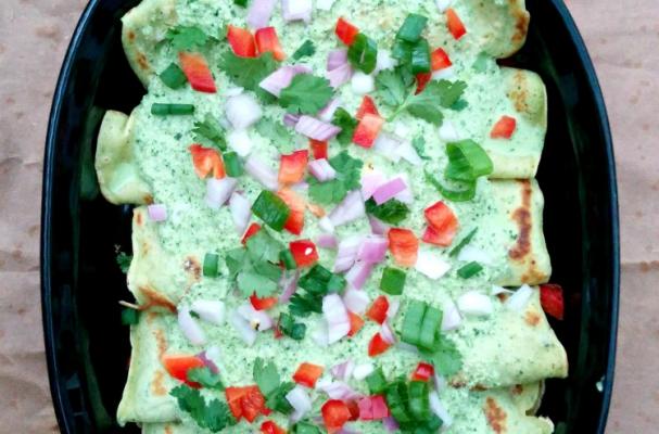 4. Assembling: In a baking dish, add some sauce at the bottom to evenly coat. Take one poblano crepe and add filling good 1-2 Tbsp or more in the centre lengthways. Roll it tightly and place seam side down on the baking dish. Repeat with the rest. Add more sauce on top. Add fresh red onions, green and red bell peppers and green onions on top.At this top, you can refrigerate it covered for later use. Bake in a pre heated 350F oven for 12-17 mins or until warmed through. Serve immediately