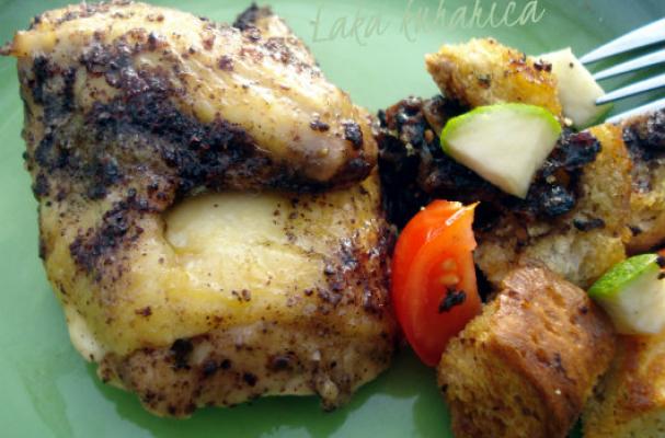 Cut the chicken into quarters and serve with bread salad.
