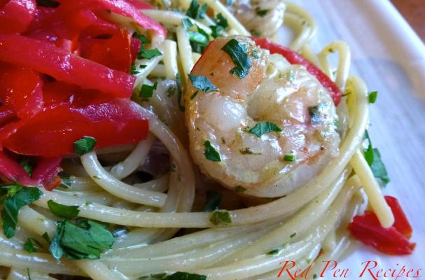 In saute pan over high heat, add the olive oil and allow to come to the verge of smoking. Next, add the shrimp and reduce the heat to medium. Continue to cook the shrimp until medium doneness, about 2 minutes, stirring frequently. After the shrimp are medium, add the onions and allow to cook until translucent, another 2 minutes. Add pesto, stir, and then deglaze the pan with the white wine. Add the heavy cream and allow to reduce by half the volume, 2 to 3 minutes. Finally, add the pasta and stir. Finish seasoning with salt, pepper and additional wine if necessary. Allow to warm for 2 minutes, and then portion and serve. Top with the parsley and tomatoes.
