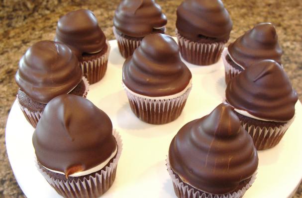 Carefully remove paper liners from cupcakes, and discard. Place cupcakes on a serving platter, and refrigerate for 30 minutes to let coating set. Cover, and refrigerate for 2 hours more. Serve cold. Cupcakes can be refrigerated for up to 3 days.