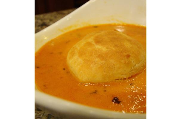 This is my take on tomato bisque. Feel free to use fresh, roasted tomatoes---just puree them with a food mill.