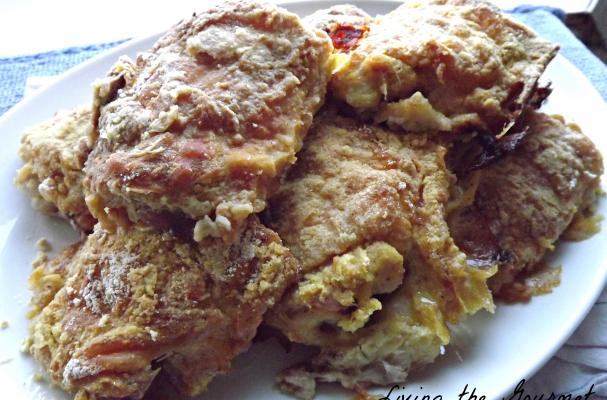 Place three bowls; one with 1 cup of flour, one with the egg wash and one with the cornmeal plus the ½ cup of flour.