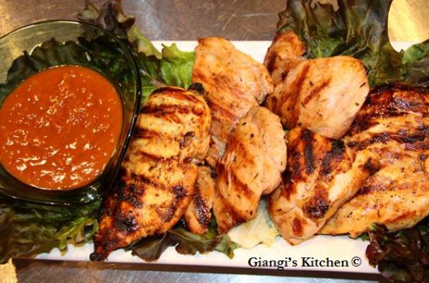 I had some time in my hands this morning and dinner come to mind. I was in the mood to grill, even though we are still on the 113 degree range. Looking in the refrigerator I had some wonderful chicken breasts and thighs. Why not marinate them and serve them with a sauce? Next thing I know, my mental recipe rolodex started turning and I remembered that I have not made this wonderful recipe for a while now. The time has come to do so. Peanut butter, onions, lemons, limes, garlic and ginger in hand, I am all set to marinate the chicken and prepare the satay sauce. The longer the chicken marinates, the better it will taste.