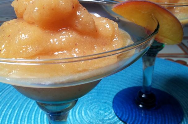 For my version I freeze the peaches so that I can add less ice. This provide a more intense "peachy" flavor. I use a bit of agave nectar to add a hint of sweetness. I think this is better than adding white sugar. Taste your peaches before adding the agave. If they are super sweet you may not need it at all. I also like to drizzle a bit of spiced rum on top of the drink. This adds a bit of spice, obviously, and keeps the drink from being overly sweet. Enjoy!