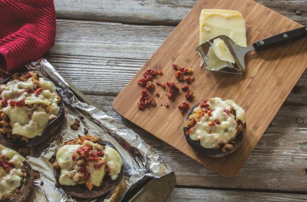 Stuff the mushroom caps generously with the filling, and top with a thin slice of Gruyère. Return the mushrooms to the grill. Close the cover and cook for 10 to 15 minutes or until the cheese has melted and the mushrooms are tender. Sprinkle with remaining dried tomatoes. Serve immediately.