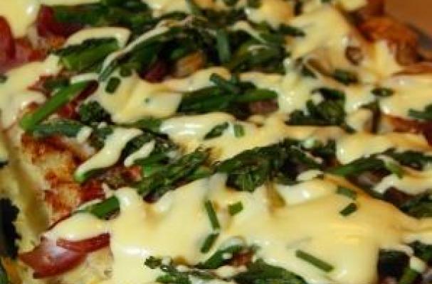 Remove from oven and drizzle with hollandaise sauce and top with chives.