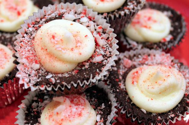 Using an apple corer, remove the center of each cupcake. Fill each cupcake with a spoonful of the Chocolate Ganache. Using the frosting-filled pastry bag, frost the cupcakes and sprinkle with crushed peppermint candies.