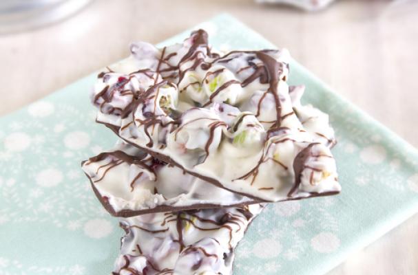 White and dark chocolate bark with cranberries and pistachios. A perfect gift for your Thanksgiving host