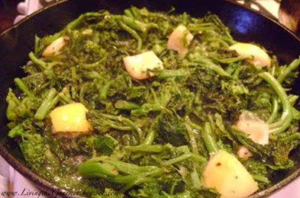 Heat a large frying pan with a few drizzles of olive oil and the chopped garlic. Carefully add the broccoli rabe and the lemon wedges. Add the seasonings and cover loosely. Sauté until the broccoli rabe has cooked down and is tender.