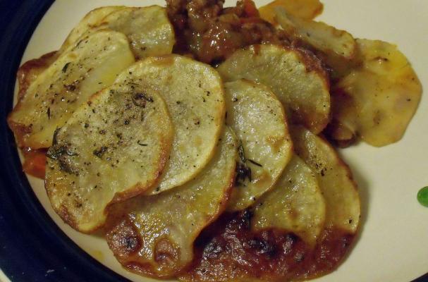 Thinly slice the potatoes using a mandolin or a sharp knife. In a medium bowl, combine potato slices with salt, pepper, fresh thyme and olive oil, gently toss to season the potatoes Top the meat mixture with potatoes, overlapping slices. Bake until potatoes are browned around edges and tender when pierced with a knife, 40 minutes. Place under the broiler for 5 minutes or until the potatoes crisp. Allow to cool 10 minutes before serving.