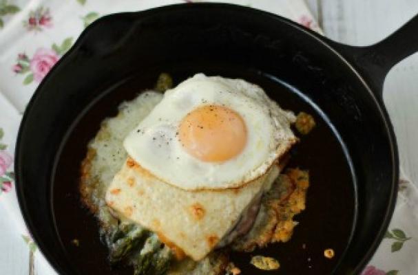 A decadent French sandwich with ham, asparagus and Gruyere cheese. Topped with bechamel and more cheese and broiled to golden brown perfection then crowned with a fried egg.