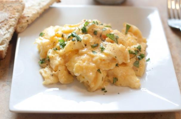 Perfect soft, fluffy, moist scrambled eggs with just the right amount of Parmesan cheese and fresh basil.