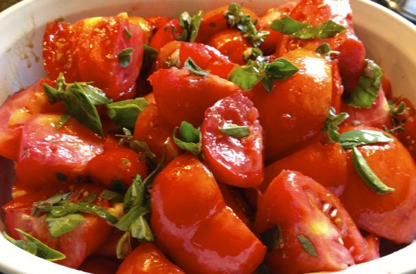 Place tomatoes in a ceramic dish and bake for 1 hour and 45 minutes at 400 degrees Fahrenheit. Serve with crusty bread.