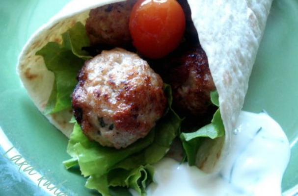 Place on each tortilla some salad, fried onion rings, tomato and 3 turkey meatballs. Roll it up into a cone shape, secure with a toothpick.