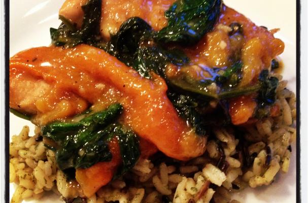Toss in the spinach and roasted peppers. Cook a few more minutes to warm the pepper and wilt the spinach. I served mine over long grain and wild rice.