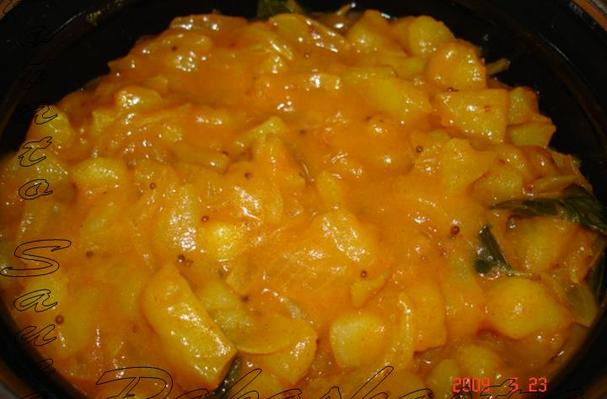 1. Fry coriander seeds(1 1/2 tsp), dry red chillies(4-5) and black gram(1 tsp) in very little oil. Grind them with grated coconut(1 cup). Add this along with boiled potato pieces and cook.