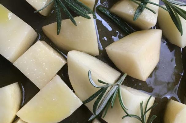 Pre-heat oven at 375 degrees. Spread 1 tablespoon of the olive oil on a cookie sheet. In a bowl add the potatoes, rosemary and the remaining olive oil. Mix well to coat all the potatoes cubes.