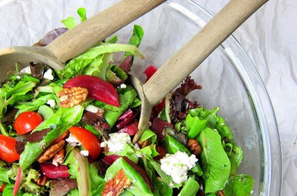 This mixed greens salad pairs beets with blue cheese and toasted pecans. Tossed with a homemade citrus vinaigrette dressing, it is a perfect addition to any dinner.