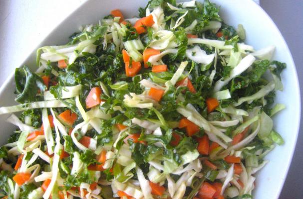 In a very large bowl, combine cabbage, kale, celery, scallion and carrot. Toss well.