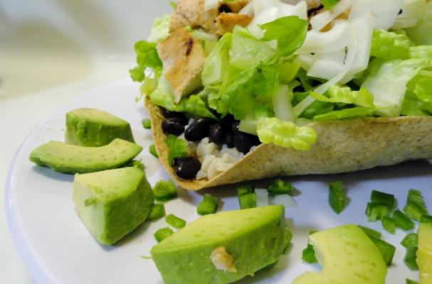 Layer all of your ingredients into the tortilla bowl as desired, and top off with a little extra marinade as a dressing. A drizzle of taco sauce also works well here if you have it sitting around.