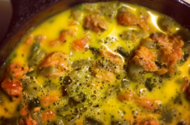 Beat the eggs, milk and Dill Salt lightly and pour over the mixture in the skillet.
