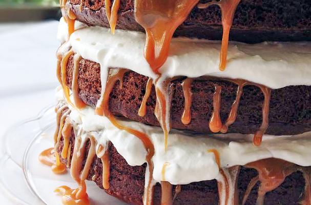 Chocolate Cake Infused with Coffee, Topped with Caramel and Whipped Cream Frosting