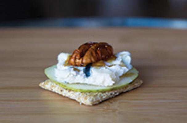 1. Slice a pear along the side and place a piece on the cracker. Put a piece of the gorgonzola cheese on top of the pear slice.