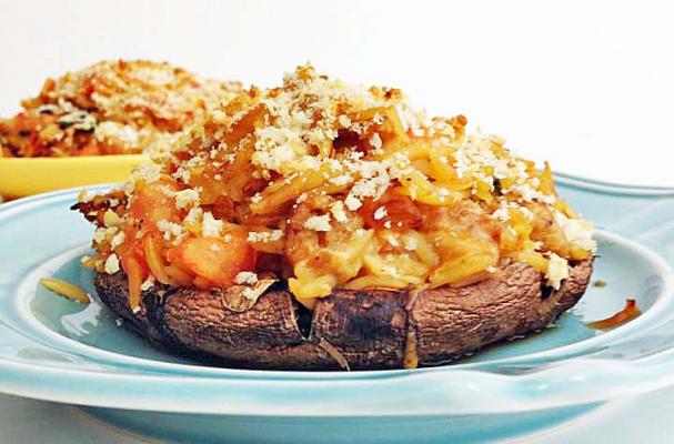 Meaty Portobellos Stuffed with Chicken Bratwursts, Tomato, Basil, Orzo and Cheese