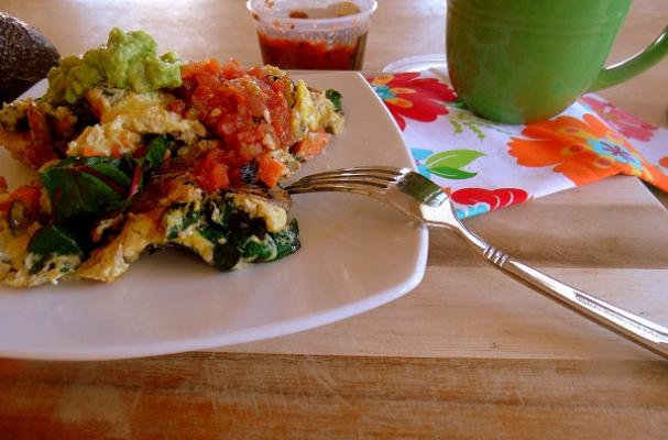 Immediately add the green onion and chard leaves. Allow to steam for about 30 seconds before pouring the scrambled egg mixture evenly over the meat and veggies. This is where the technique comes in. Avoid the temptation to stir. Simply allow the skillet to sit 2 to three minutes. Then, using a wooden spoon or spatula, begin flipping sections of egg and veggies (similar to how you would fold whipped egg whites into a cake batter, just gently fold the scramble onto itself). Once all sections have been flipped over, everything to sit and cook another 2 or 3 minutes. Repeat the flipping. Continue doing this until the egg is no longer cooking to the skillet.