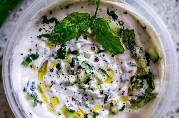To make it look fancy, garnish with more mint leaves and tiny pieces of cucumber, a good grind of black pepper and drizzle with olive oil.