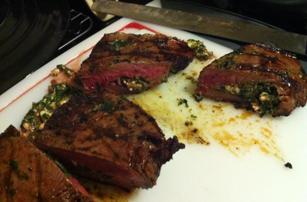 Put as much of that stuffing into the steak as you can. Use a small spoon, a fork or your fingers. Don’t worry about getting it on the outside of the steak.